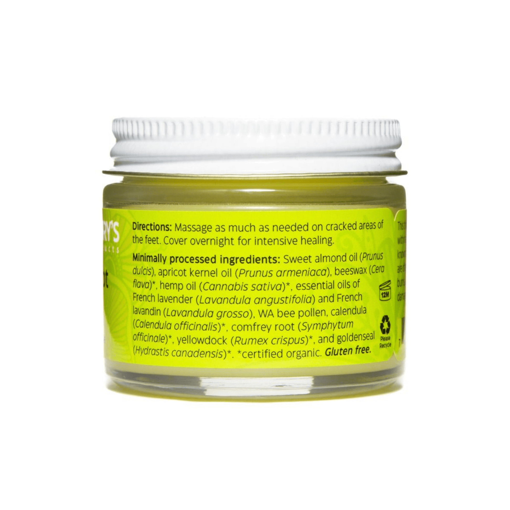 This thick, healing salve helps repair painful cracked feet with natural herbs and oils. Lavender and calendula are known for their cleansing and soothing properties, and are often used for dermal ailments like acne, rashes, and burns. Organic hemp oil helps nourish and moisturize damaged skin.