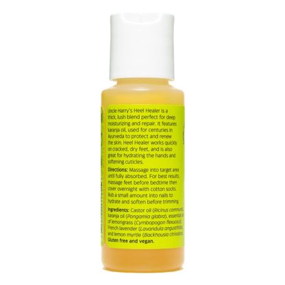 A thick healing blend with soothing karanja and pure essential oils. Uncle Harry’s Heel Healer is a thick, lush blend perfect for deep moisturizing and repair. It features karanja oil, used for centuries in Ayurveda to protect and renew the skin. Heel Healer works quickly on cracked, dry feet, and is also great for hydrating the hands and softening cuticles. Packaging may vary.