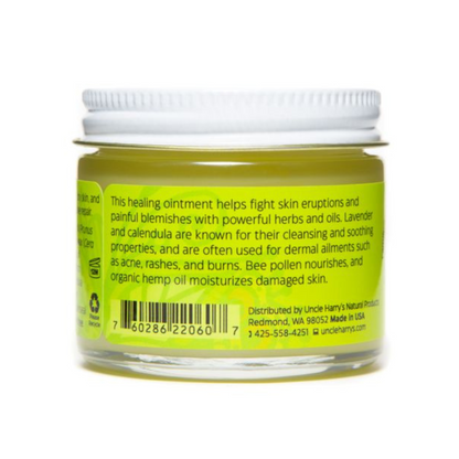This healing ointment helps fight acne and painful blemishes with natural herbs and oils. Lavender and calendula are known for their antiseptic and soothing properties, and are often used for dermal ailments such as acne, rashes, and burns. Organic hemp oil helps nourish and moisturize damaged skin.