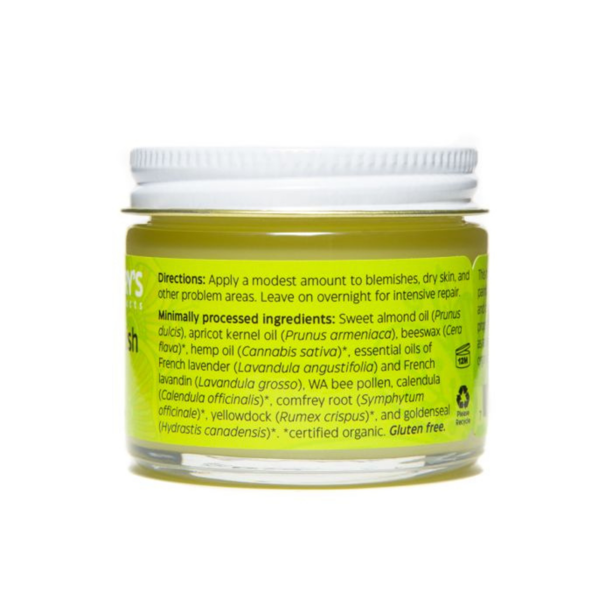 Sweet almond oil, apricot kernel oil, organic beeswax, organic hemp oil, lavender essential oil, organic calendula, organic comfrey, propolis, organic yellowdock, and organic goldenseal. Gluten free.