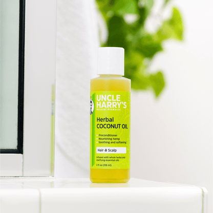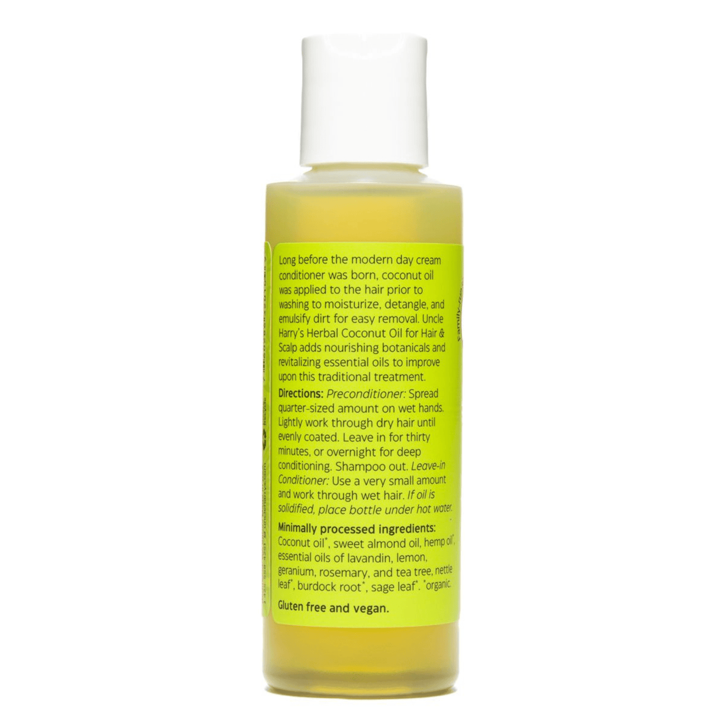 Coconut oil infused with whole herbs and clarifying essential oils to soothe and soften. Long before the modern day cream conditioner was born, coconut oil was applied to the hair prior to washing to moisturize, detangle, and emulsify dirt for easy removal. Uncle Harry’s Herbal Coconut Oil for Hair & Scalp adds nourishing botanicals and revitalizing essential oils to improve upon this traditional treatment. Packaging may vary.
