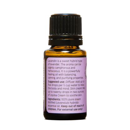 Lavandin is a sweet hybrid type of lavender. The aroma can be slightly camphorous and herbaceous. It is a powerfully healing oil with balancing, calming, and purifying properties.