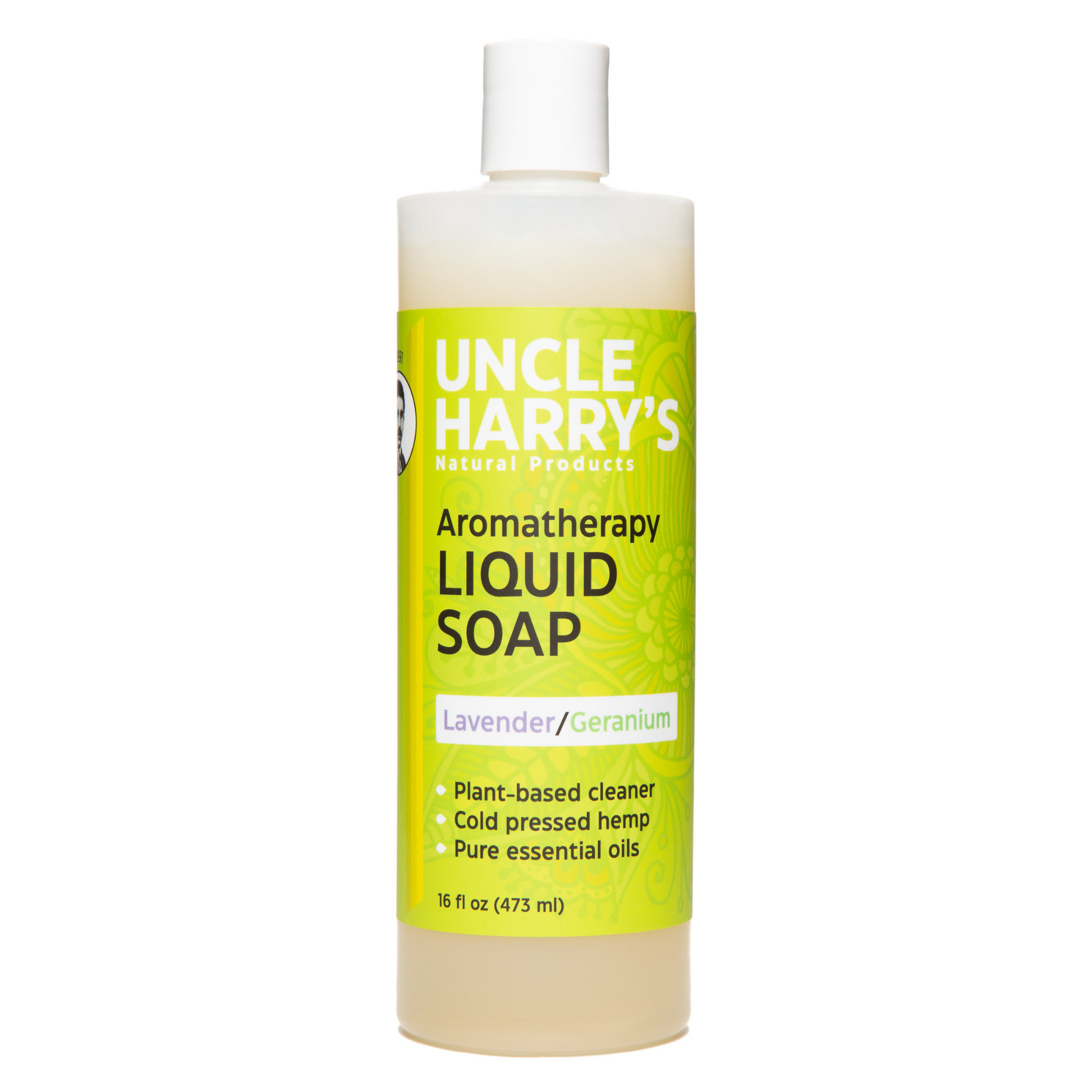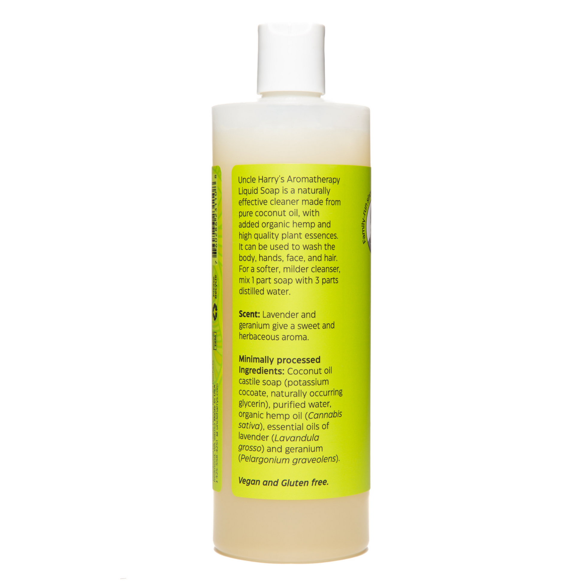 Uncle Harry's Aromatherapy Liquid Soap is a naturally effective cleaner made from pure coconut oil, boosted with organic hemp and high quality plant essences. It is a plant-based cleaner with nourishing hemp oil, for body and hands. It contains no added emulsifiers or thickeners, making it more liquid and concentrated. A little goes a long way! A little goes a long way! Lavender and geranium add a sweet and herbaceous aroma.