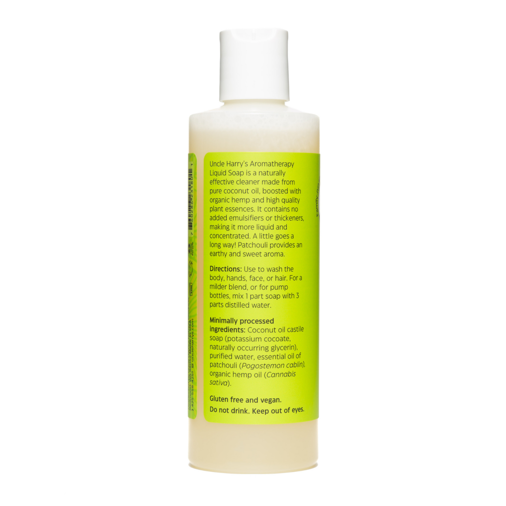Uncle Harry's Aromatherapy Liquid Soap is a naturally effective cleaner made from pure coconut oil, boosted with organic hemp and high quality plant essences. It is a plant-based cleaner with nourishing hemp oil, for body and hands. It contains no added emulsifiers or thickeners, making it more liquid and concentrated. A little goes a long way! Patchouli provides an earthy and sweet aroma.