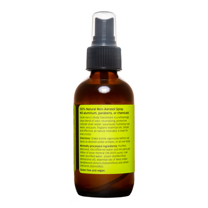 Uncle Harry's Body Deodorant is a refreshingly clean blend of odor-neutralizing, protective colloidal silver water, luxuriously hydrating rose water, and pure, fragrant essential oils. Simple and effective, as nature intended. A treat for everybody!