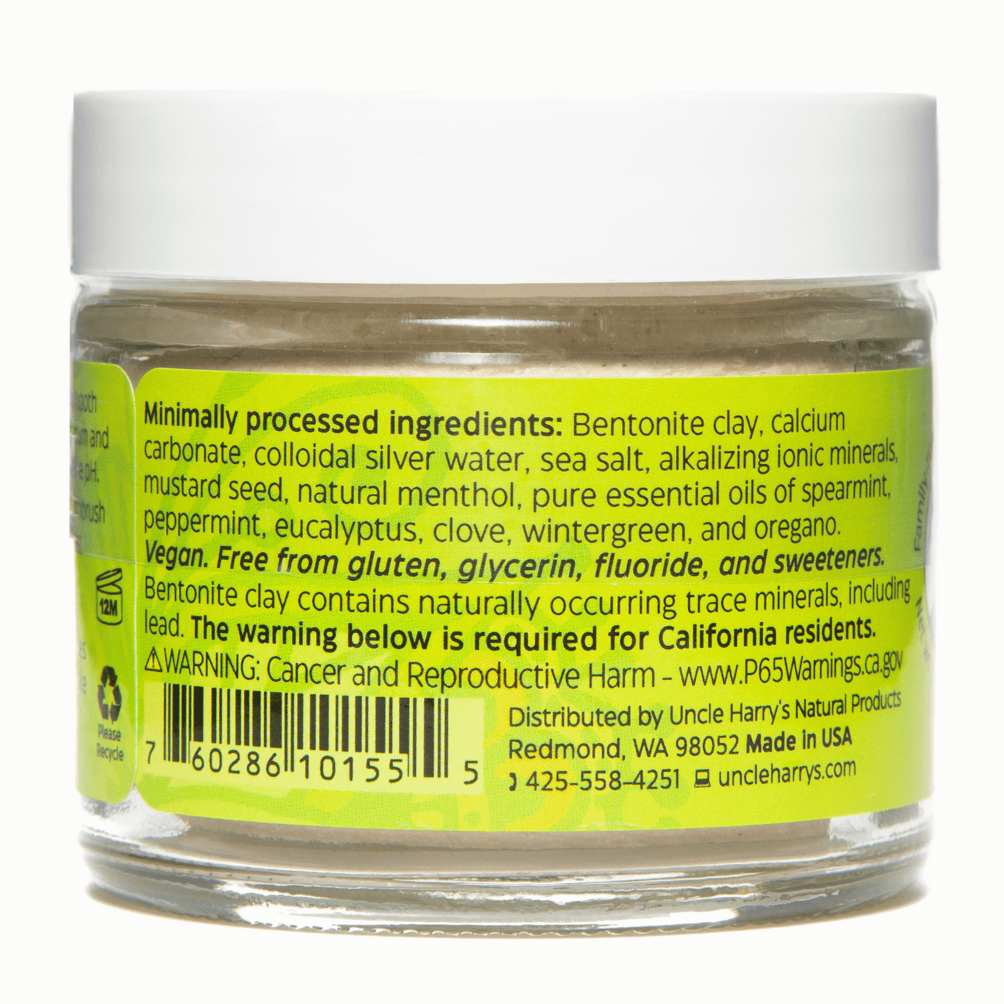 Minimally processed ingredients: Purified water, bentonite clay, calcium carbonate, sea salt, alkalizing ionic minerals, mustard seed powder, natural menthol (Mentha arvensis), essential oils of spearmint (Mentha spicata), peppermint (Mentha piperita), eucalyptus (Eucalyptus globulus), clove bud (Eugenia caryophyllus), wintergreen (Gaultheria procumbens), and wild oregano (Origanum vulgare).