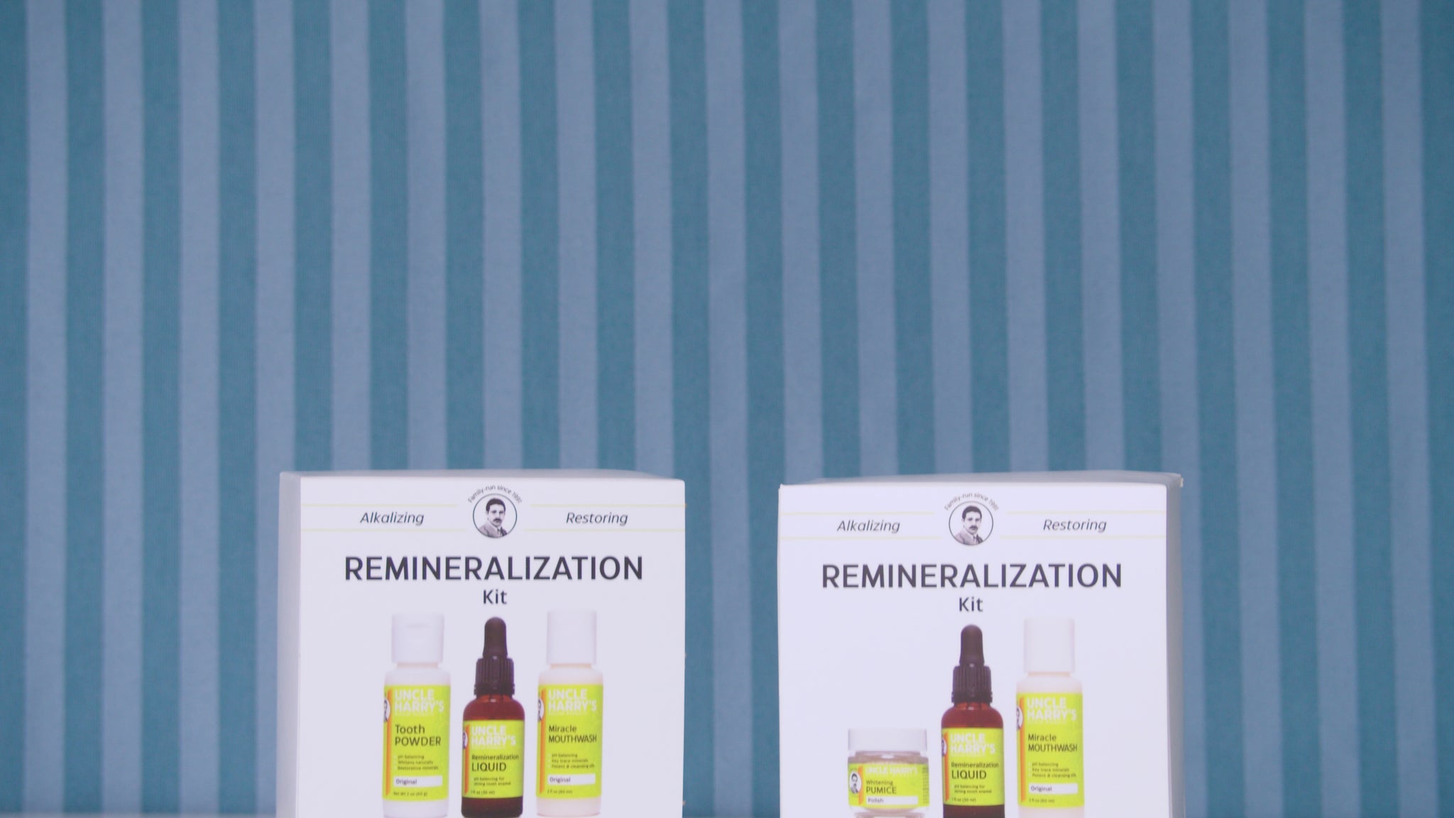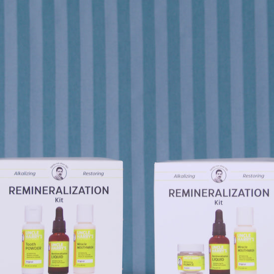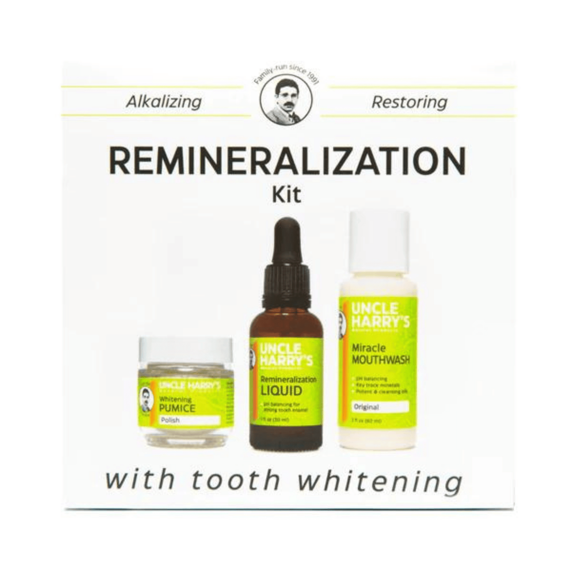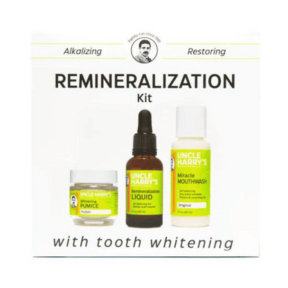 Tooth enamel can erode for many reasons, often from acids lingering in the mouth or a lack of viable nutrients. If enamel wears thin, sensitivity to cold and hot temperatures can develop, followed by cavities and decay. Discoloration and yellow teeth are common attributes of thin enamel. Once enamel is gone completely and dentin is exposed, irreversible tooth loss can occur. Uncle Harry's Remineralization Kit with Whitening is a natural, safe, and effective way to correct and prevent continued loss of tooth enamel. Daily use can help strengthen enamel, stabilize cavities from further demineralization, and whiten teeth.Kit includes one Miracle Mouthwash (2 fl oz); one Whitening Toothpaste Polish (1.25 oz glass jar); and one Liquid Remineralization for Tooth Enamel (1 fl oz).