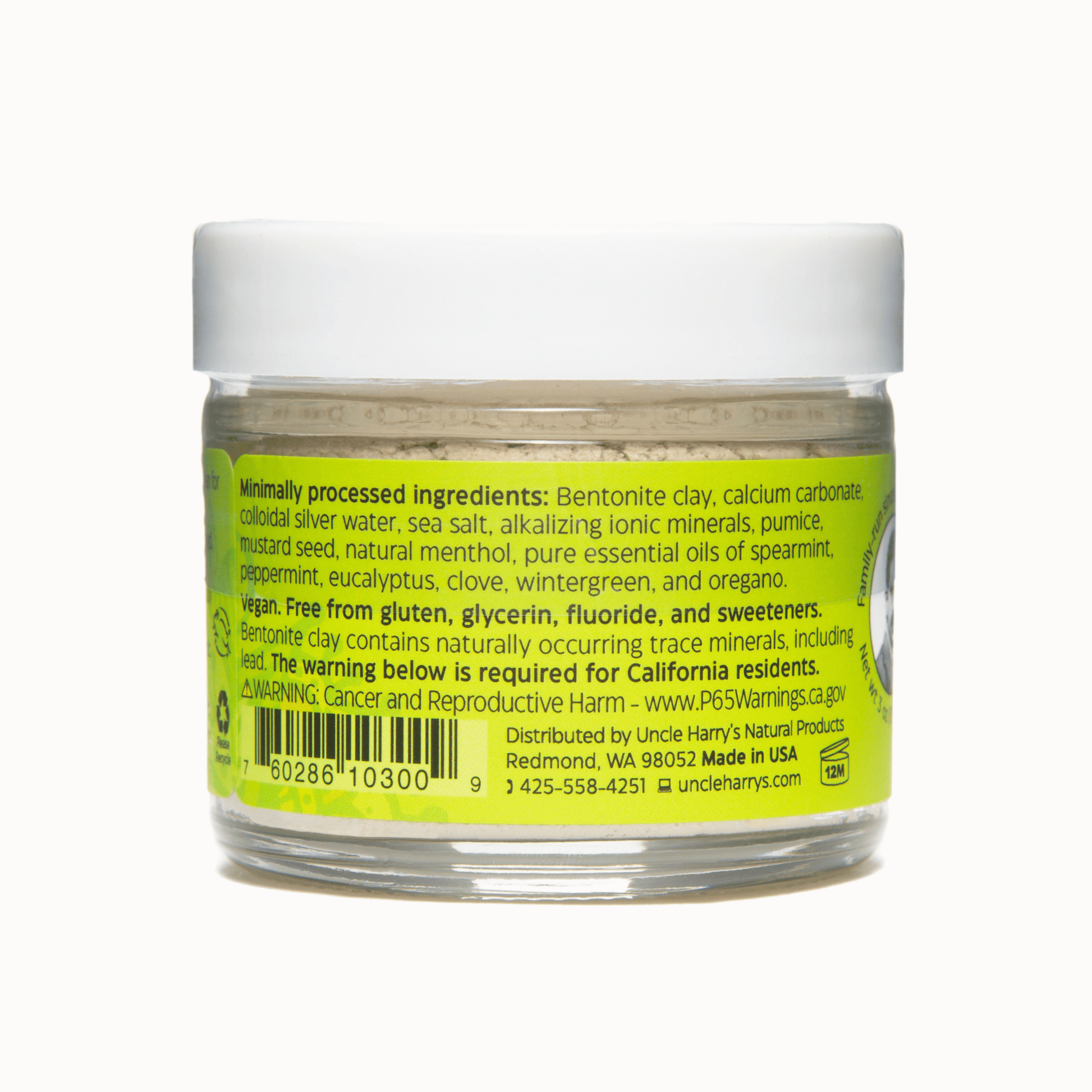 Bentonite clay, calcium carbonate, colloidal silver water, sea salt, alkalizing ionic minerals, pumice, mustard seed, natural menthol, pure essential oils of spearmint, peppermint, eucalyptus, clove, wintergreen, and oregano.