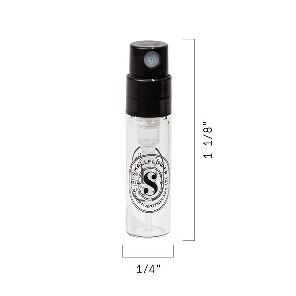 Samples are either packaged by the perfume house, or hand-poured here at Smallflower and presented in a 0.7 ml size (each 1 ml vial is filled 3/4 full for ease of application).