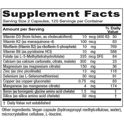 Important trace minerals and vitamins: Manganese, Boron, Zinc, Copper, and Vitamin B6 and Methylated Folate (as L-5-MTHF)
